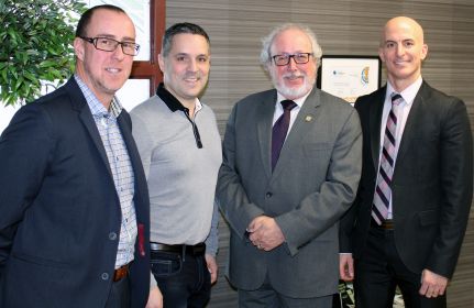 Sur la photo, on aperçoit MM. Francis Fréchette et Frédéric Ouellet, dirigeants de Thibault GM Montmagny │La Pocatière et de Pneus André Ouellet (aussi représentants des Enfants d'coeur), et MM. Jean-Guy Desrosiers et Félix Michaud, respectivement maire et directeur général de la Ville de Montmagny.