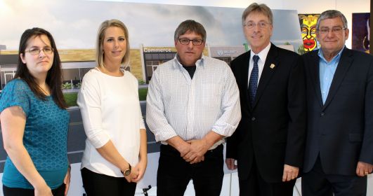 Photo: Plusieurs représentants des partenaires impliqués, soit Mme Mélanie Demers, représentante du Groupe resto Bégin, Mme Joanie Bertrand, propriétaire de la Clinique dentaire de Montmagny, M. Réal Samson, promoteur, M. Rémy Langevin, maire de Montmagny, et M. Raymond Samson, promoteur.