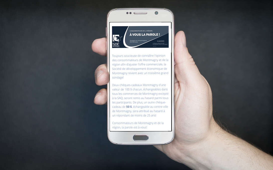 Toujours soucieuse de connaître l'opinion des consommateurs de Montmagny et de la région afin d'ajuster l'offre commerciale sur son territoire, la Société de développement économique (SDÉ) de Montmagny cède la parole à la population dans le cadre de son 3e grand sondage, qui se déroulera du 9 novembre au 11 décembre prochain.
