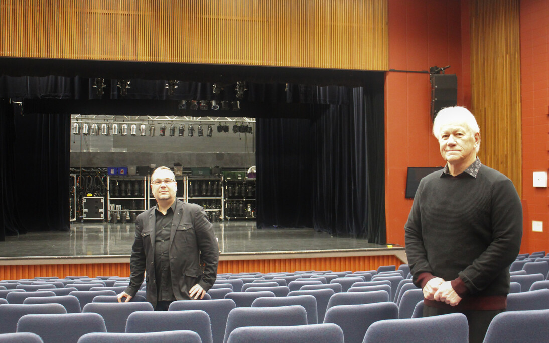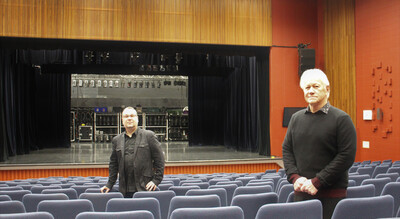 Sur la photo, on aperçoit le directeur général des Arts de la scène de Montmagny, M. Christian Noël, en compagnie du maire de la Ville de Montmagny, M. Bernard Boulet, dans l'actuelle salle Edwin-Bélanger.