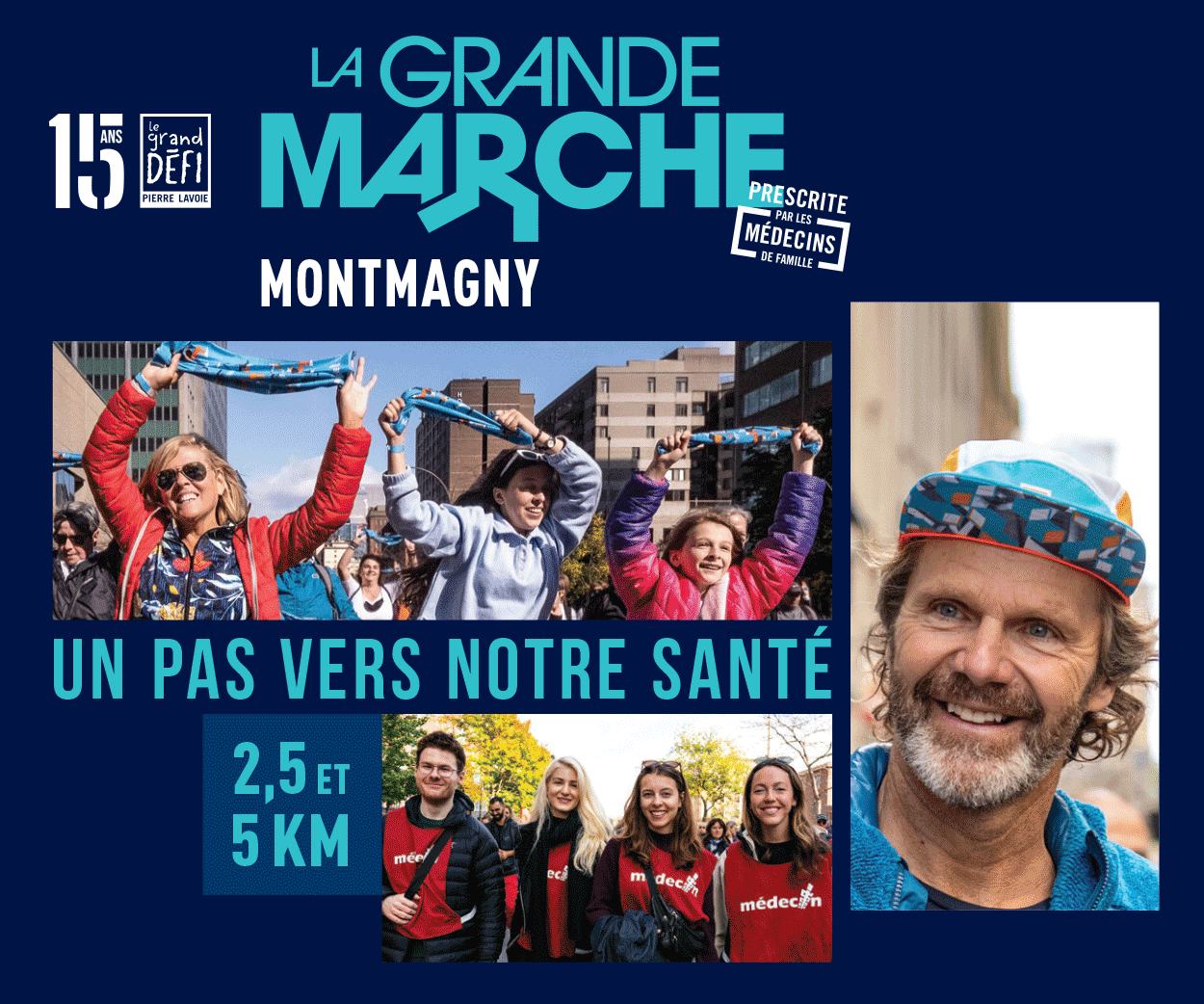 Dans moins de 10 jours, soit le samedi 14 octobre à 13 h, le départ de la 6e édition de La Grande marche de Montmagny sera donné au parc Saint-Nicolas. Avec 529 marcheurs inscrits à ce jour, Montmagny s'illustre de belle façon à nouveau cette année en faisant partie du top 10 des villes du Québec ralliant le plus grand nombre de participants. Et ce qui est encore plus remarquable, c'est que 11 médecins de famille font partie du lot ; une donnée qui positionne Montmagny tout juste derrière Montréal et Québec! Voilà qui démontre bien l'engouement des Magnymontois pour l'évènement.