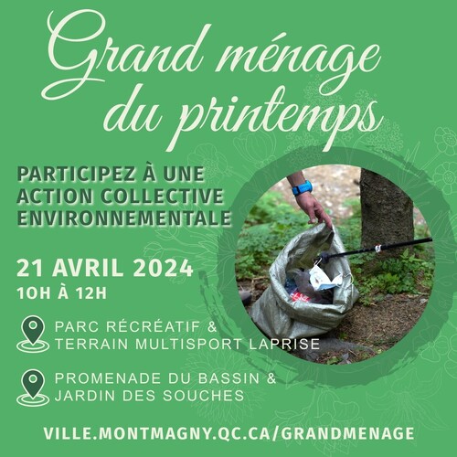 Le Comité de la famille et des aînés de la Ville de Montmagny invite la population à prendre part à un « grand ménage du printemps » le dimanche 21 avril prochain. L'objectif est simple : ramasser un maximum de détritus! Cette initiative citoyenne, proposée par Annie Beaumont, vise à mobiliser le plus grand nombre de personnes possible dans une action environnementale qui s'inscrit en marge du Jour de la Terre.