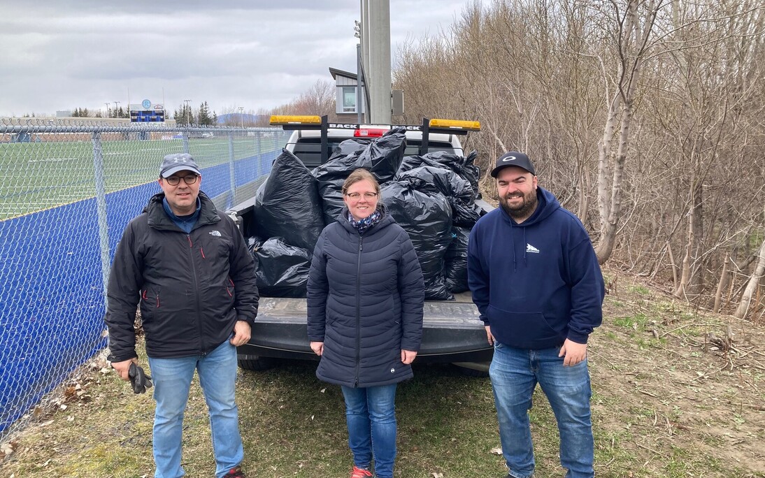 Sur la photo, on aperçoit Stéphane Dion, un citoyen bénévole, en compagnie de Manon Garant et Patrick Vachon, membres du Service des loisirs, de la culture et de la vie communautaire de la Ville de Montmagny et représentants municipaux au sein du Comité de la famille et des aînés, devant la camionnette qui contient tous déchets récupérés.