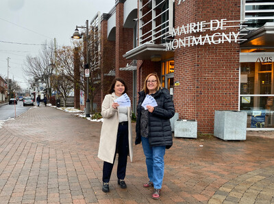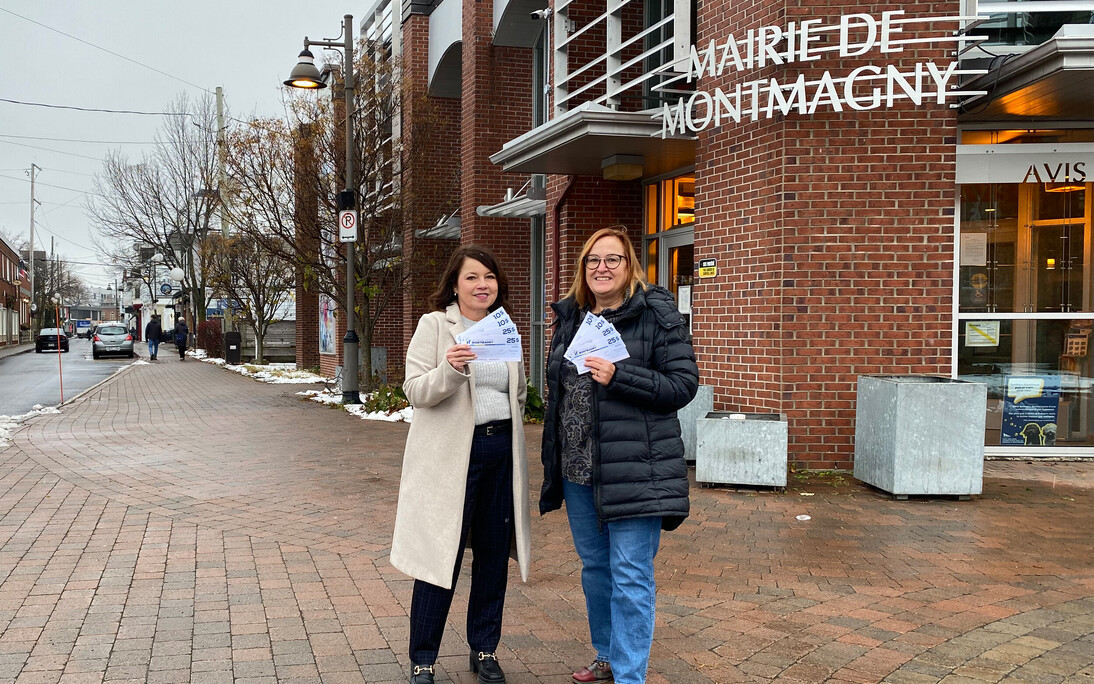 Photo: Anie Beaudet, démarcheuse à la SDÉ de Montmagny, et Nicole Robert, directrice de la CCIM, devant l'hôtel de ville de Montmagny, l'un des cinq points de vente des chèques-cadeaux Montmagny.