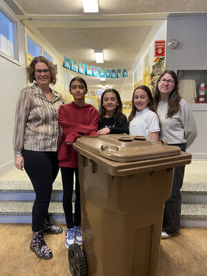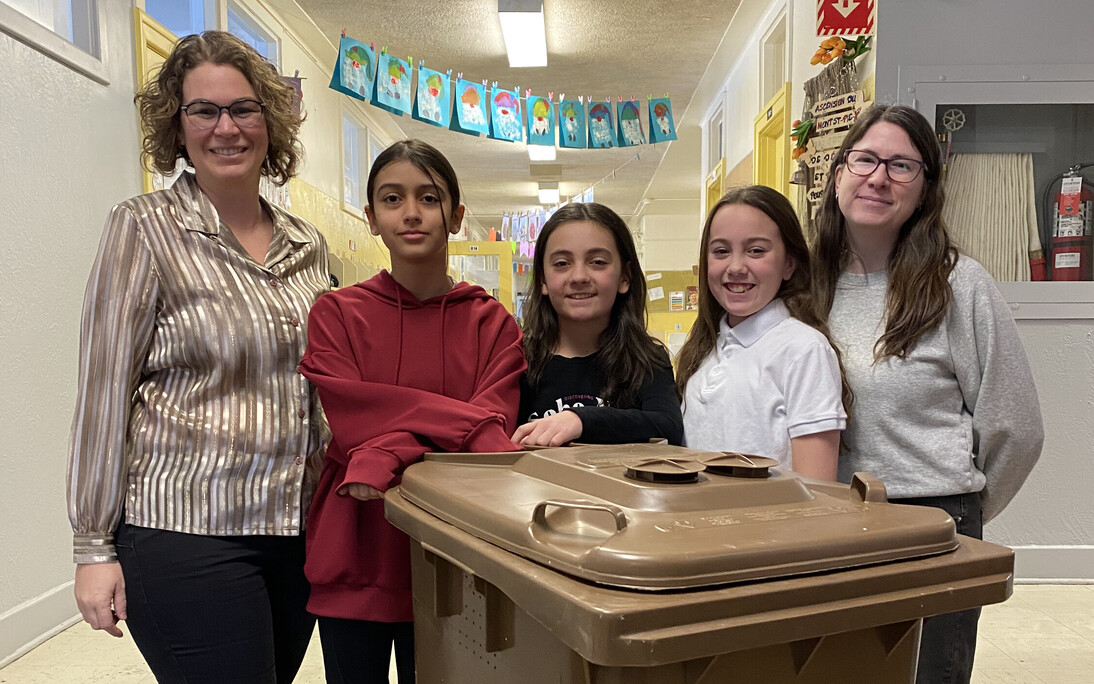 Photo du haut: On aperçoit Gabrielle Brisebois, mairesse de Montmagny, et Maude Côté, enseignante, en compagnie de Charlotte Maurice, Emy Carrier-Lamarre et Annabelle Cliche, les trois étudiantes instigatrices de l'implantation de la collecte des matières organiques à l'école Saint-Pie X.