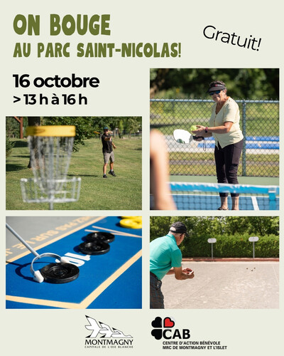 Au lendemain de la Journée internationale des aîné(e)s tenue le 1er octobre, le Service des loisirs, de la culture et de la vie communautaire s'associe au Centre d'action bénévole (CAB) des MRC de Montmagny et de L'Islet pour faire bouger les personnes aînées.