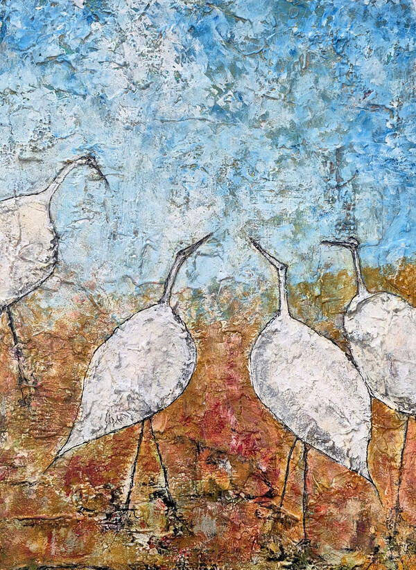 J'aime superposer les couches, créer des transparences et laisser émerger des traces qui témoignent du processus créatif lui-même. Les canevas réalisés en techniques mixtes — acrylique, lavis, encre, grattage, collages et feuilles d'or — portent une texture évoquant les trois éléments de la nature. À travers une esthétique à la fois primitive et contemporaine, j'invite le spectateur à réfléchir au lien qui unit l'humain à la nature et aux forces qui traversent l'histoire du temps.
