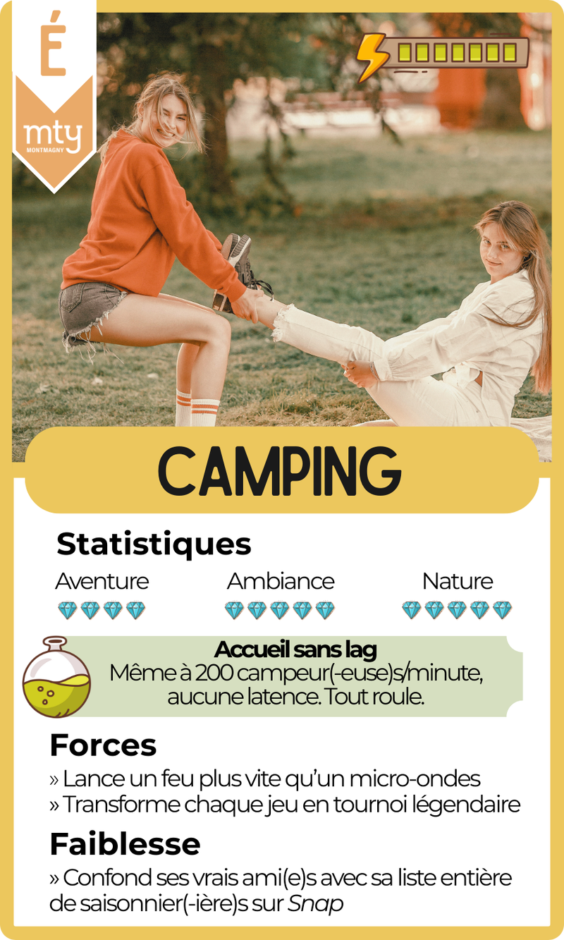 Tu es l'étincelle du camping ! Ton but est de créer une ambiance festive et d'organiser des activités qui feront en sorte que tous et toutes se souviendront de leurs vacances chez nous longtemps.